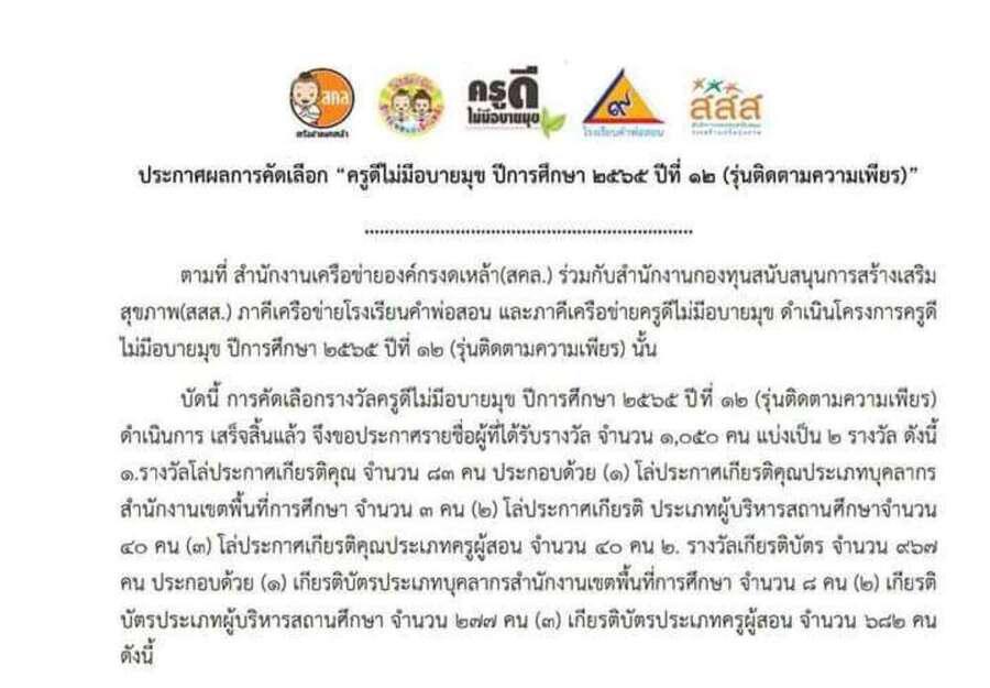 วันจันทร์ที่ 1 พ.ค. 2566 ขอแสดงความยินดีผู้บริหารโรงเรียนและข้าราขการครูที่ได้รับรางวัลครูดี ไม่มีอบายมุข ประจำปีการศึกษา 2565 ครั้งที่ 12 จากสำนักงาน เครือข่ายองค์กร งดเหล้า(สคล.) S:0