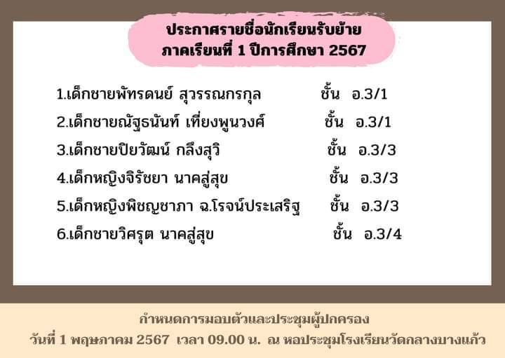 ประกาศรายชื่อ นักเรียนรับย้าย ระดับอนุบาล